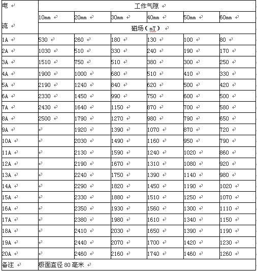 4.4 磁場(chǎng)強度:工作氣隙20mm時(shí),80mm極頭中心磁場(chǎng)最大H≥2.2T